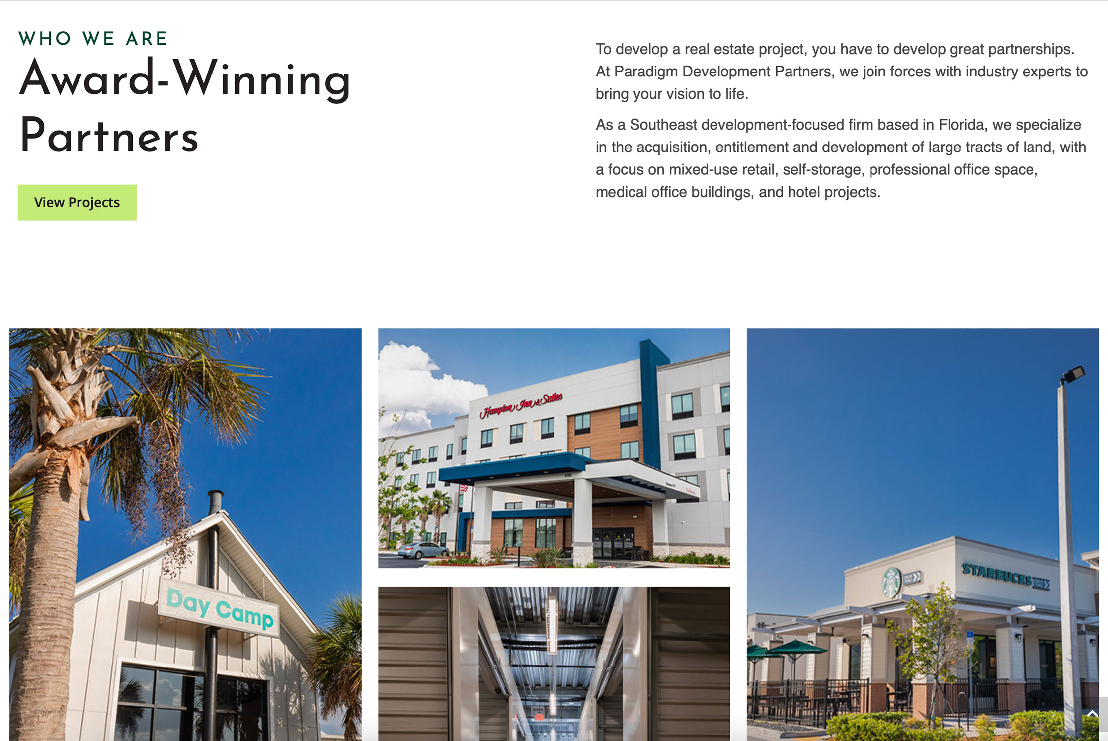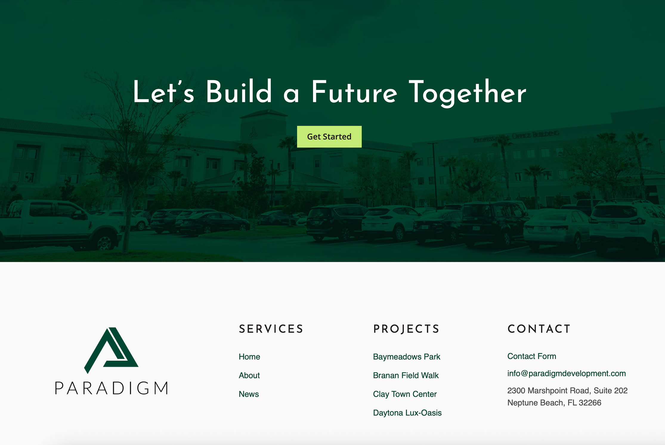 After shifting their business model from finance lending services to commercial development, Paradigm Development requested a brand and website refresh. Working together with their team, we updated their brand messaging and all content to reflect their specialty – the acquisition and development of large tracks of land. The new website highlights their experience, professionalism, and nationally-recognized partners. A gallery featuring photos and specs as well as news section of published press releases allows potential customers to learn about current and past projects, further solidifying Paradigm as an expert in their field.