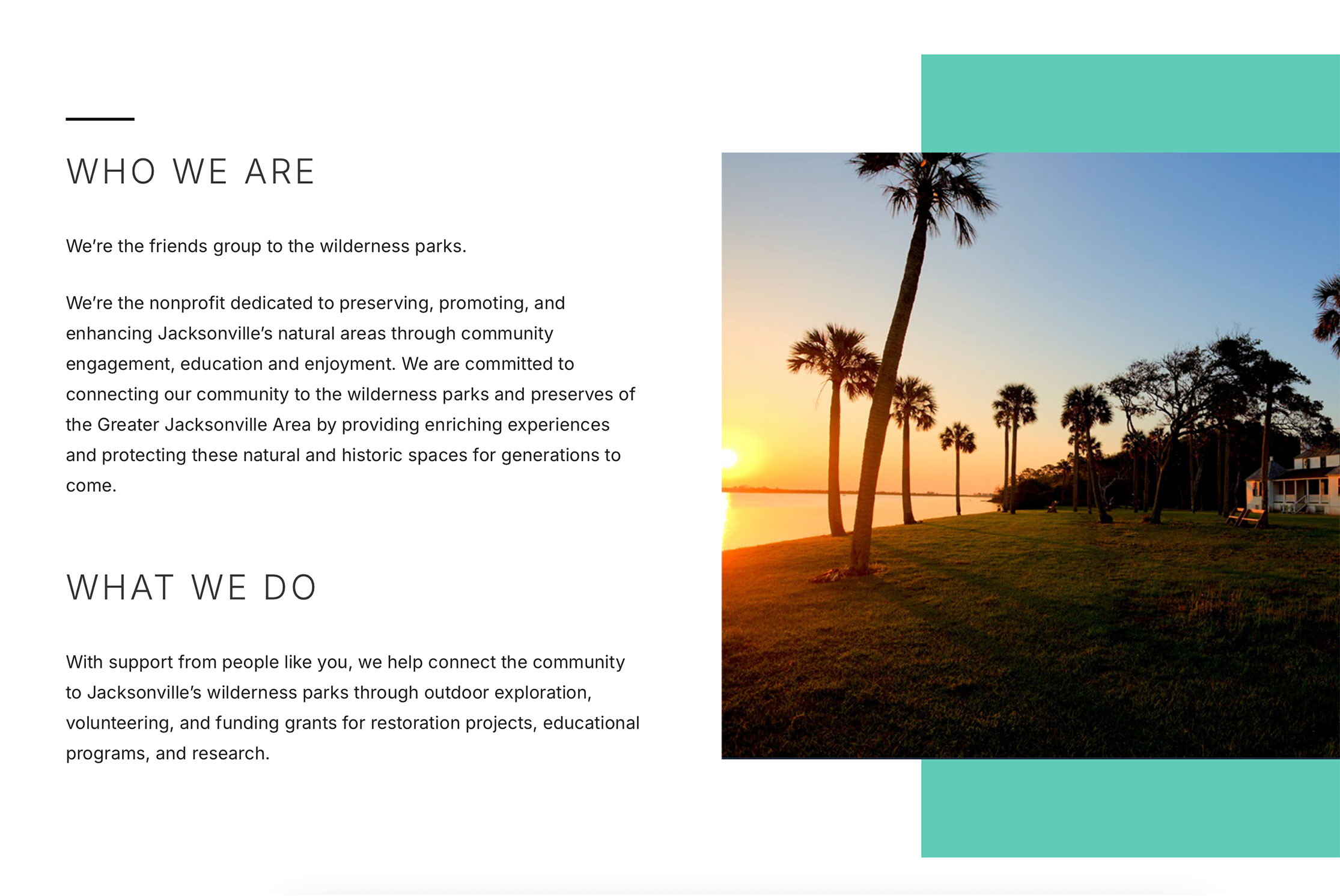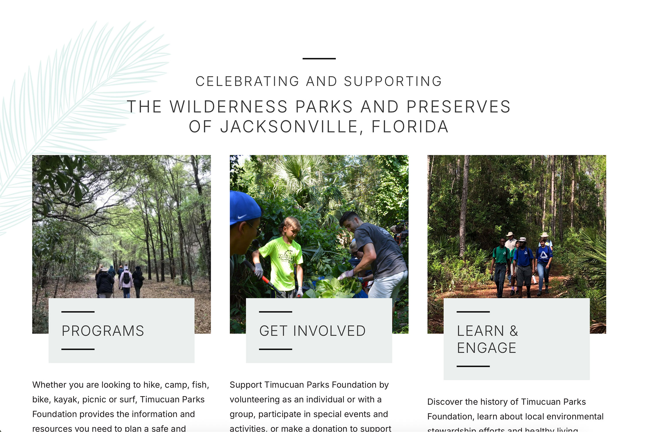 The new website for Timucuan Parks Foundation features a modern, user-centric design that prioritizes ease of navigation, ensuring visitors can easily find exactly what they are looking for. An interactive parks feature allows users to browse the numerous parks and preserves in Jacksonville, Florida, each with branded icons for various amenities and individual pages listing full park details. Seamless integration with third party platforms make financially supporting the foundation easy, either through an online donation, annual membership or corporate sponsorship. Ongoing events, community initiatives and volunteer opportunities are highlighted and regularly updated through our support plan, all on a mobile responsive, accessible website.