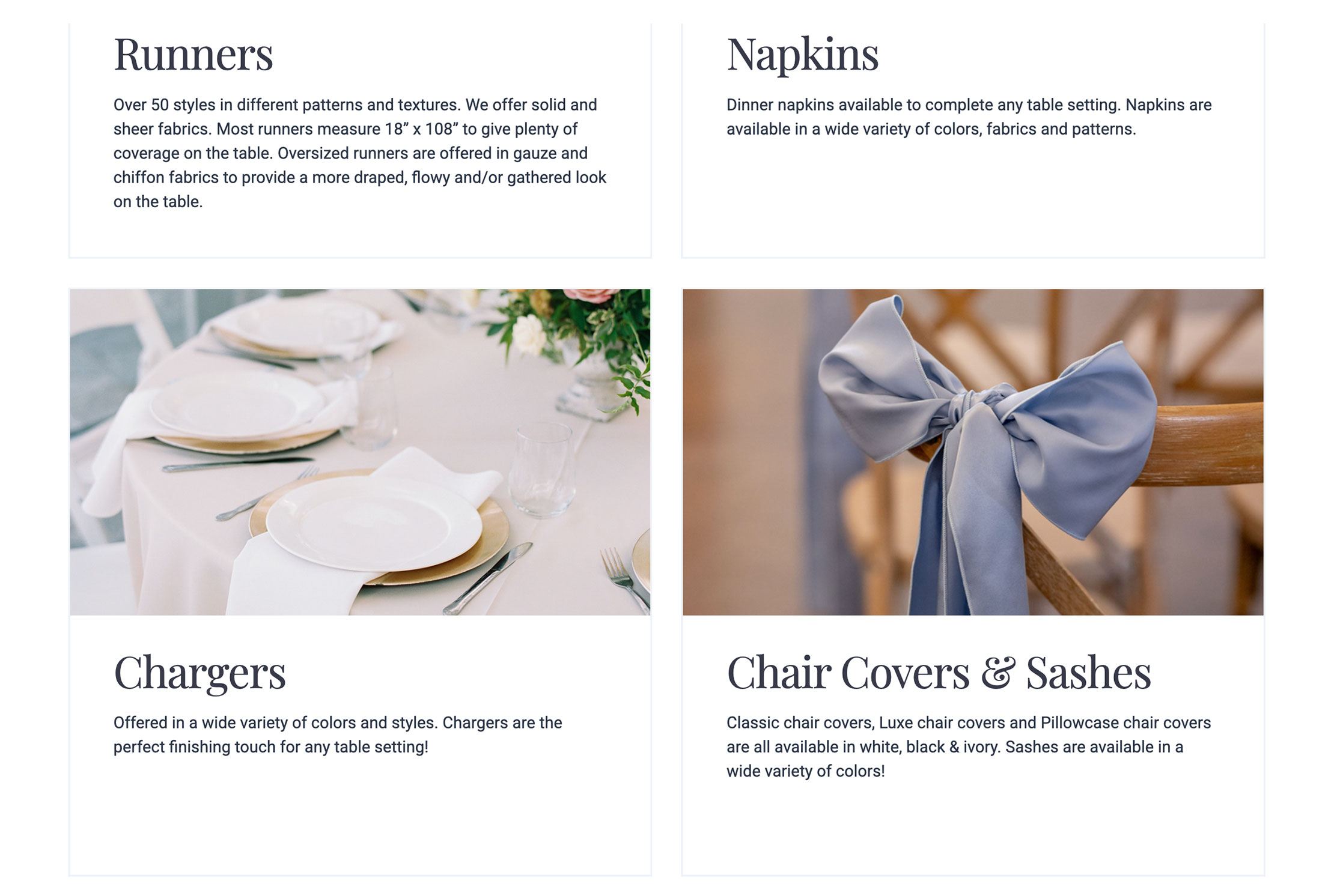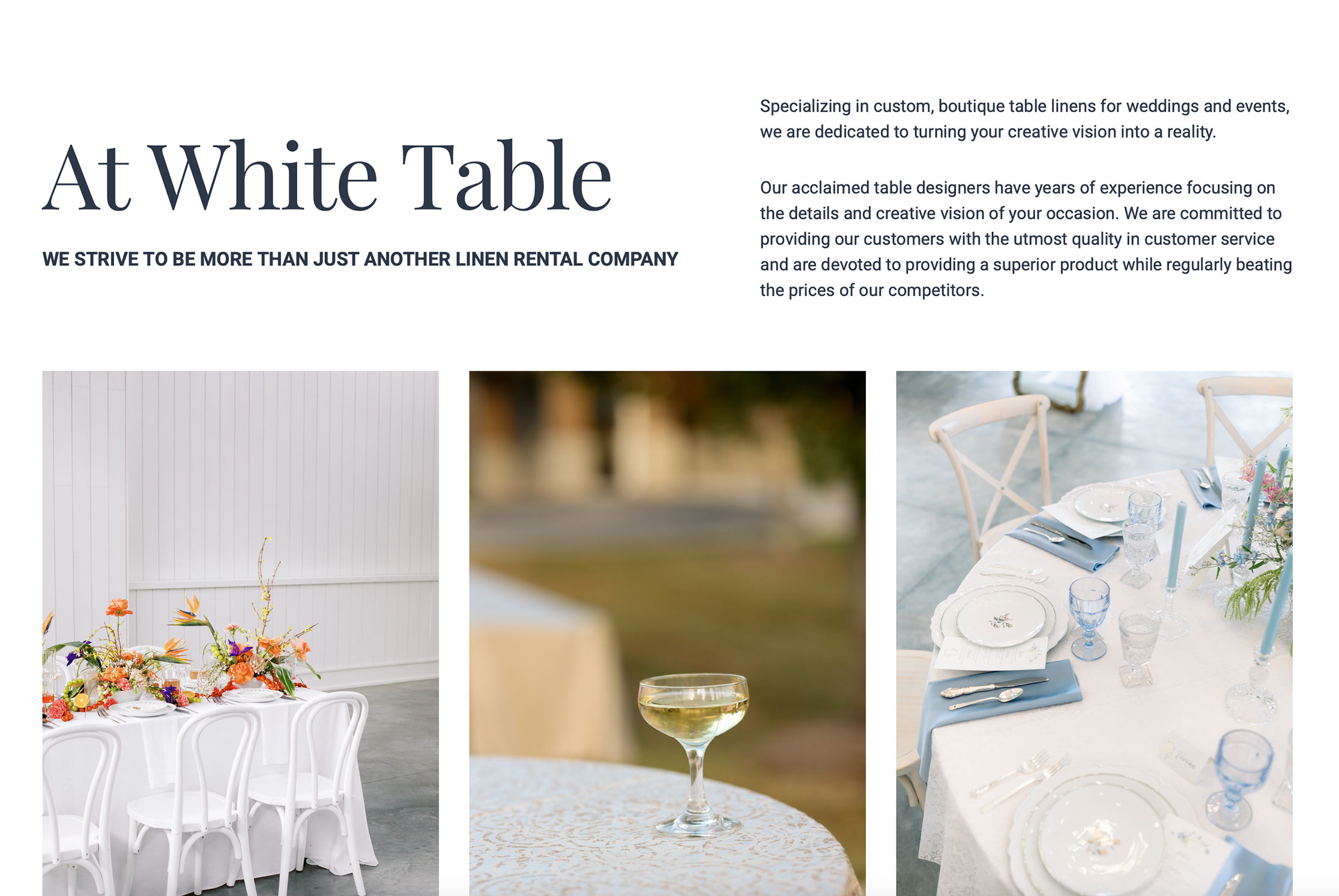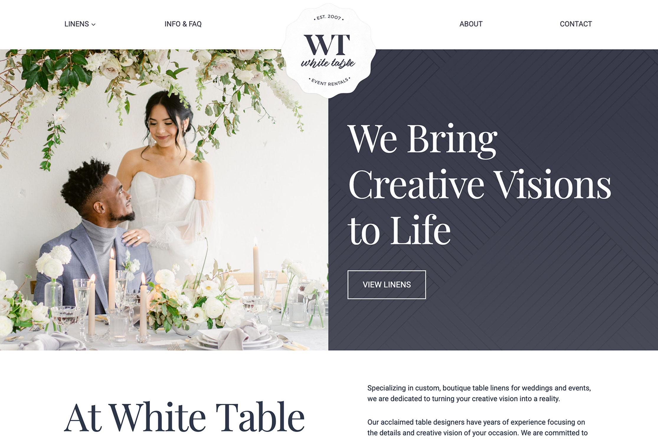 For this longtime client, we developed a visually captivating website that reflects White Table’s luxury and attention to detail. The design features clean, elegant layouts with high quality imagery of both standard and specialty linens, emphasizing their use in creating sophisticated tablescapes for weddings and elevated events.